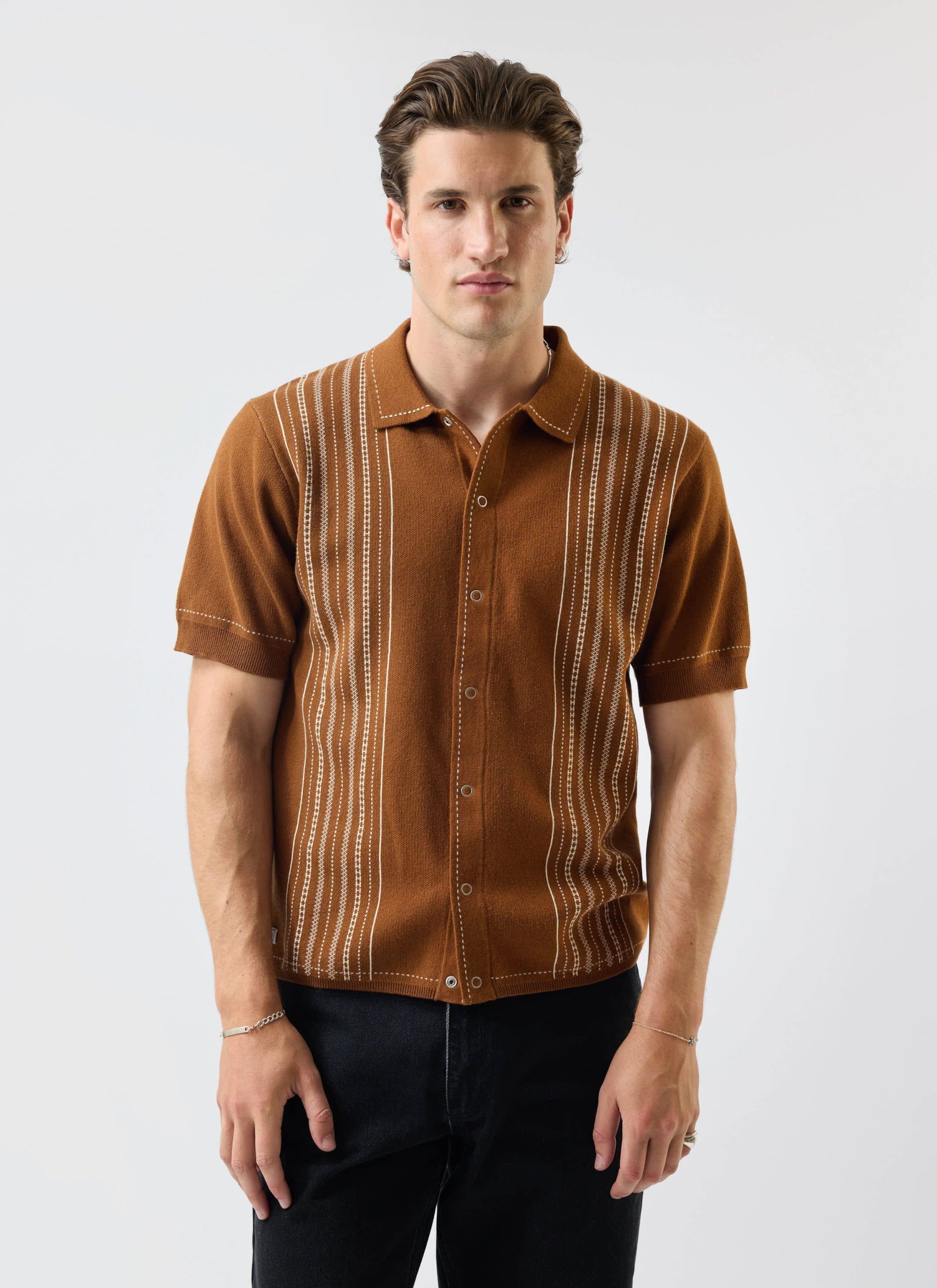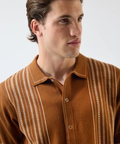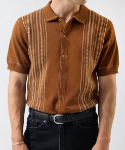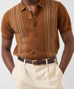 - Features: Men’s knitted shirt in warm tobacco brown, blending timeless style with comfort. Made from 100% cotton to keep you cool and comfortable in all types of weather and occasions. Designed with short ribbed sleeves, a classic button-down front with snap buttons, and custom designed stitching, this knit shirt is a versatile staple that works for both smart and casual events.