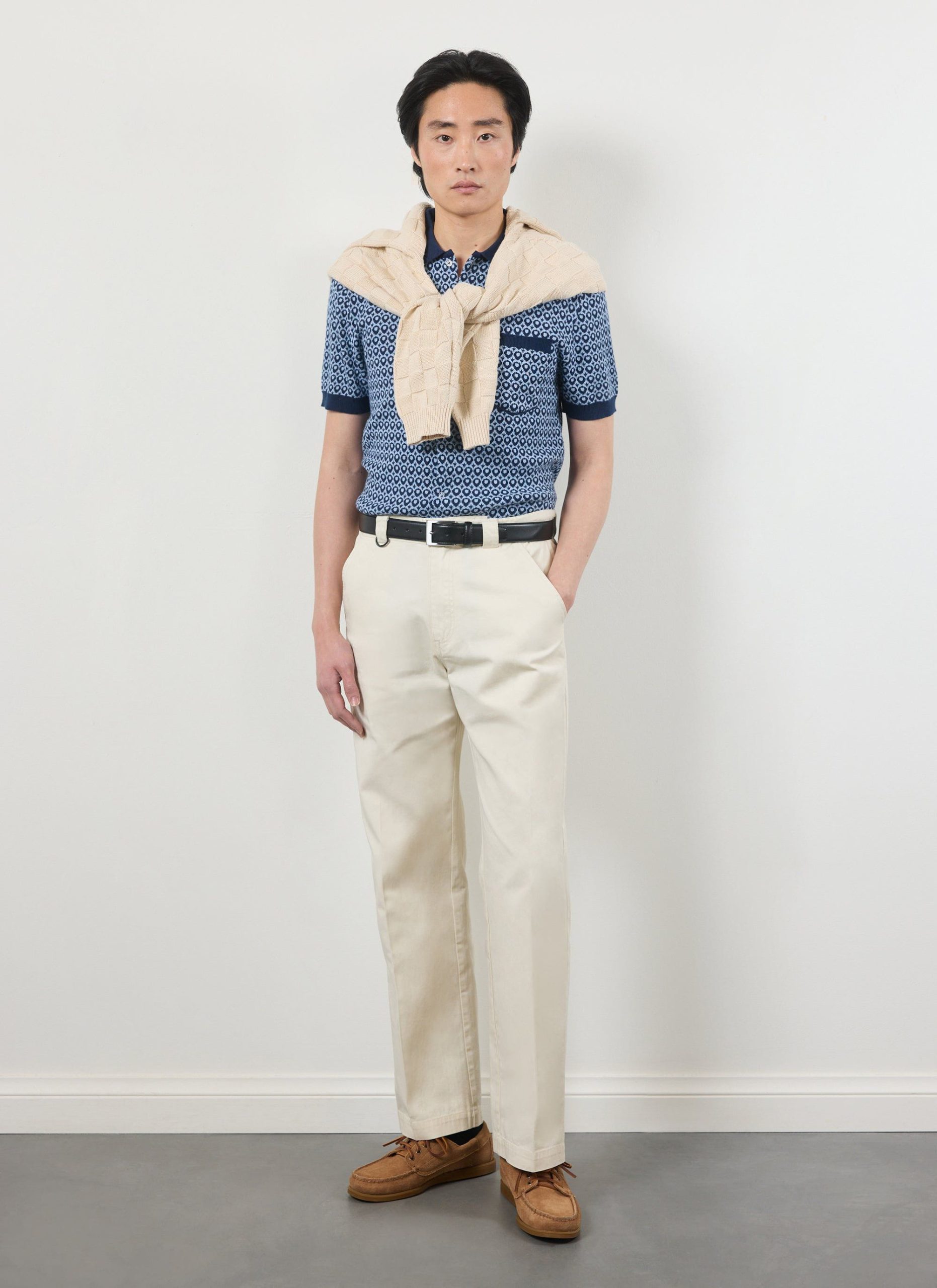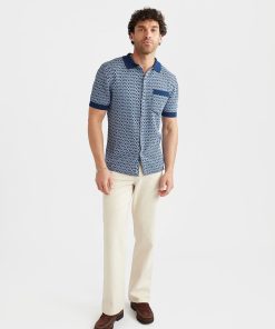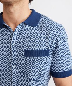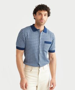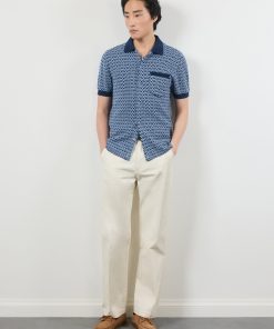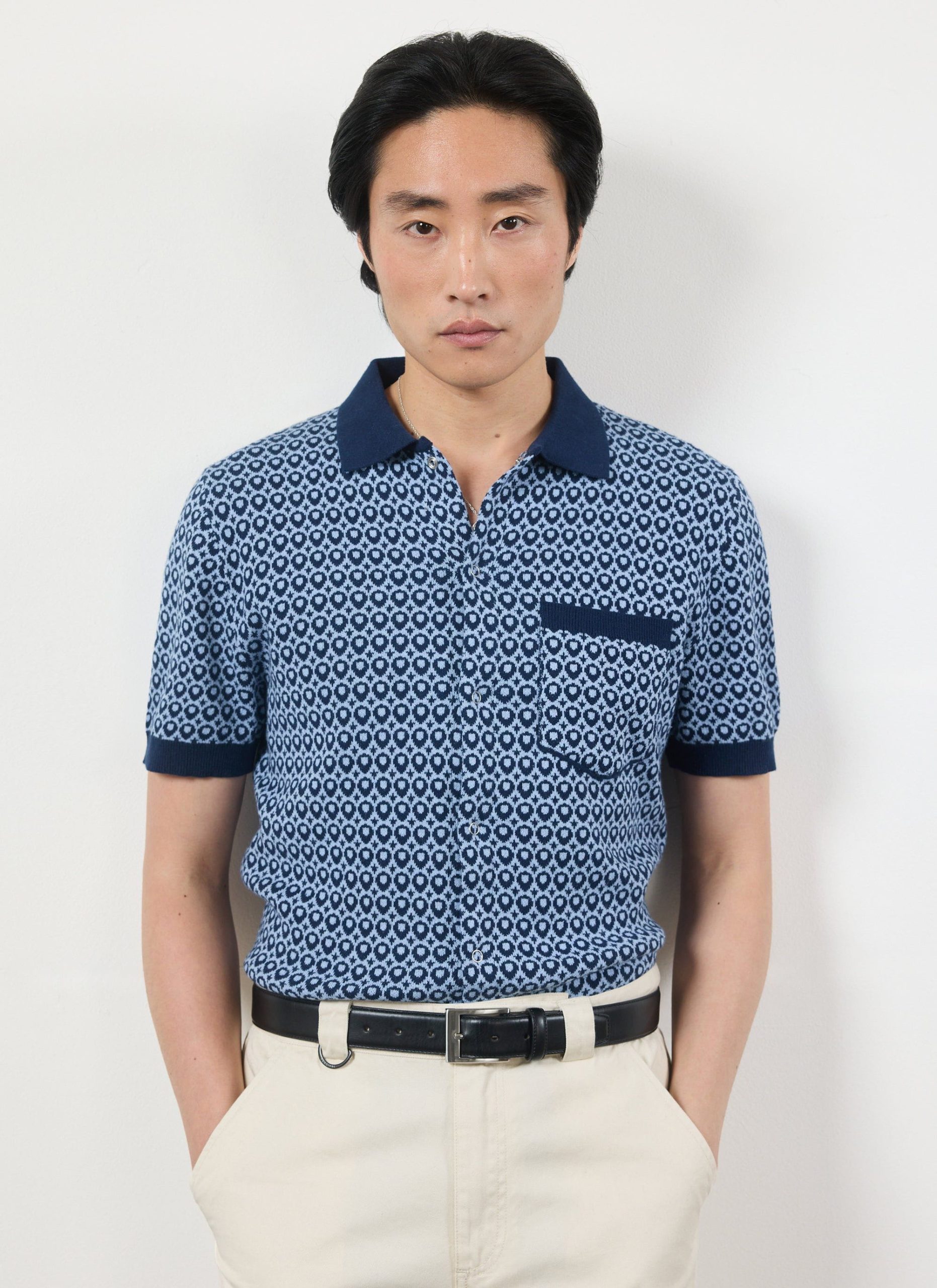- Features: Men’s Short Sleeve Knitted Shirt in Blue Jacquard. Crafted for style and comfort, this patterned shirt features a classic regular fit and detailed with snap buttons, a front chest pocket, and refined ribbed trims on the collar and sleeves. Designed to hold its shape while feeling soft on the skin, this men’s knitwear shirt offers year round wearability. The versatile Casa Picante can be easily layered or worn on its own, pairing effortlessly with any style of trousers for an elevated, everyday look.