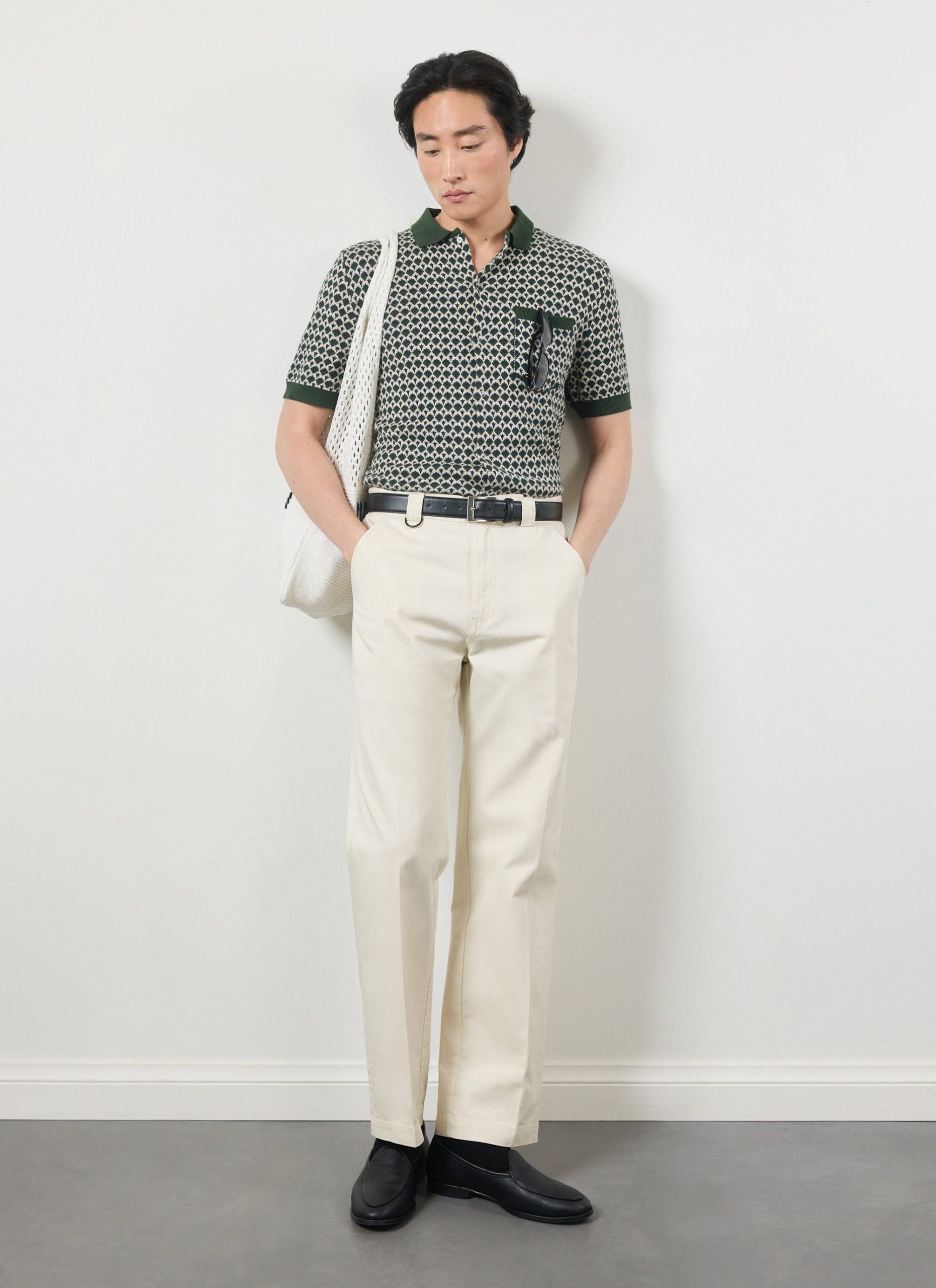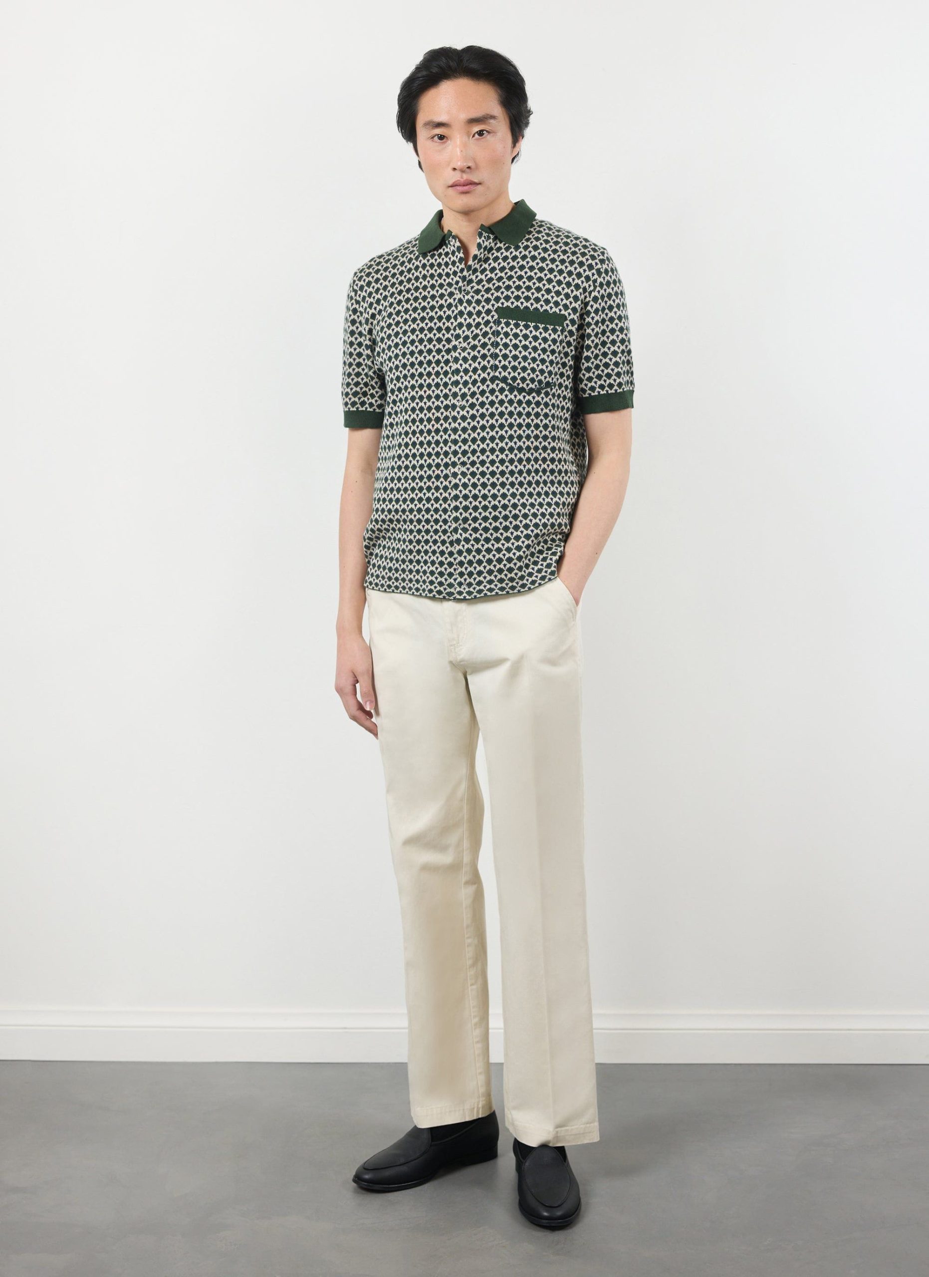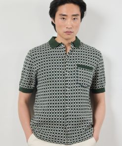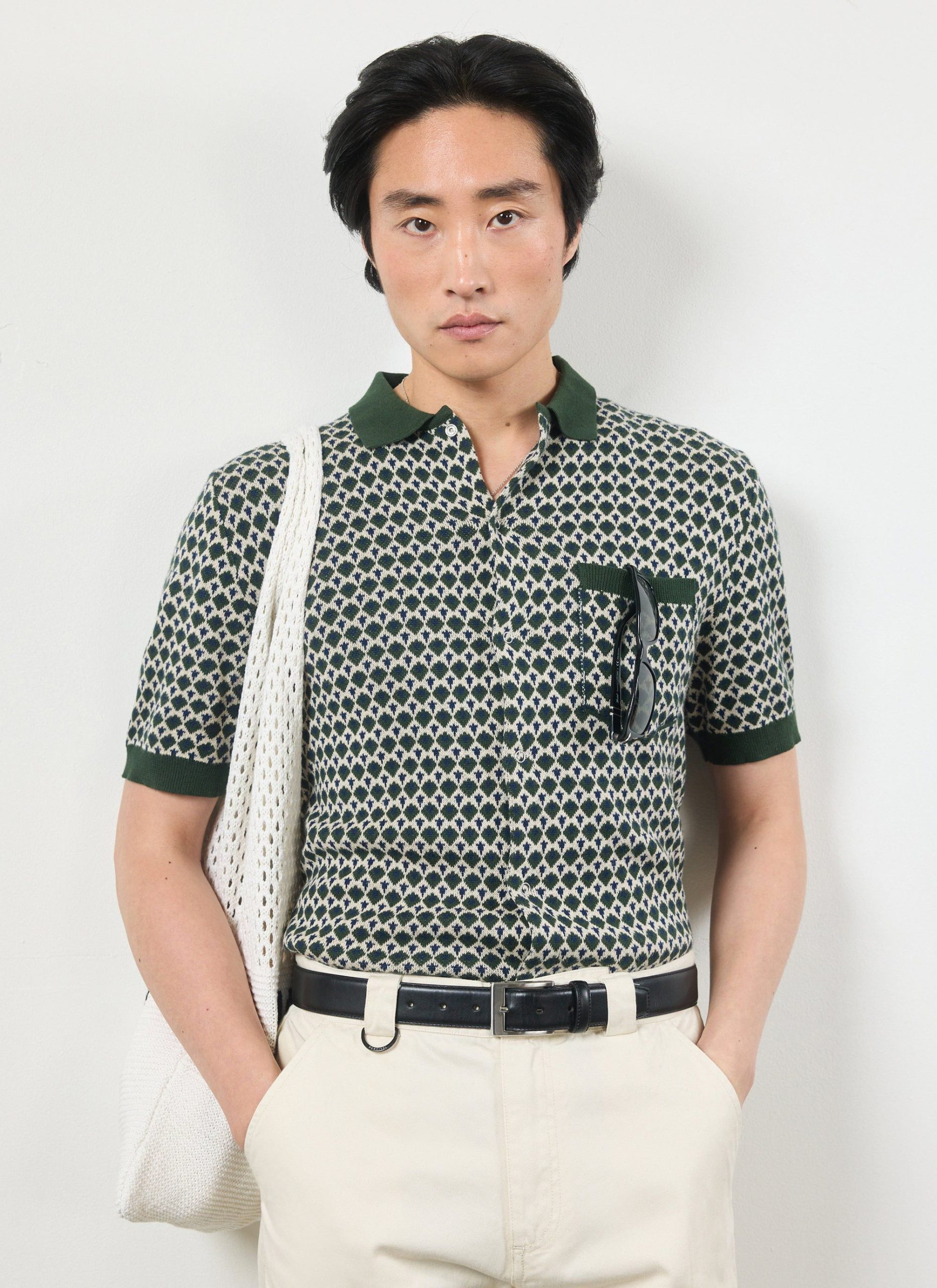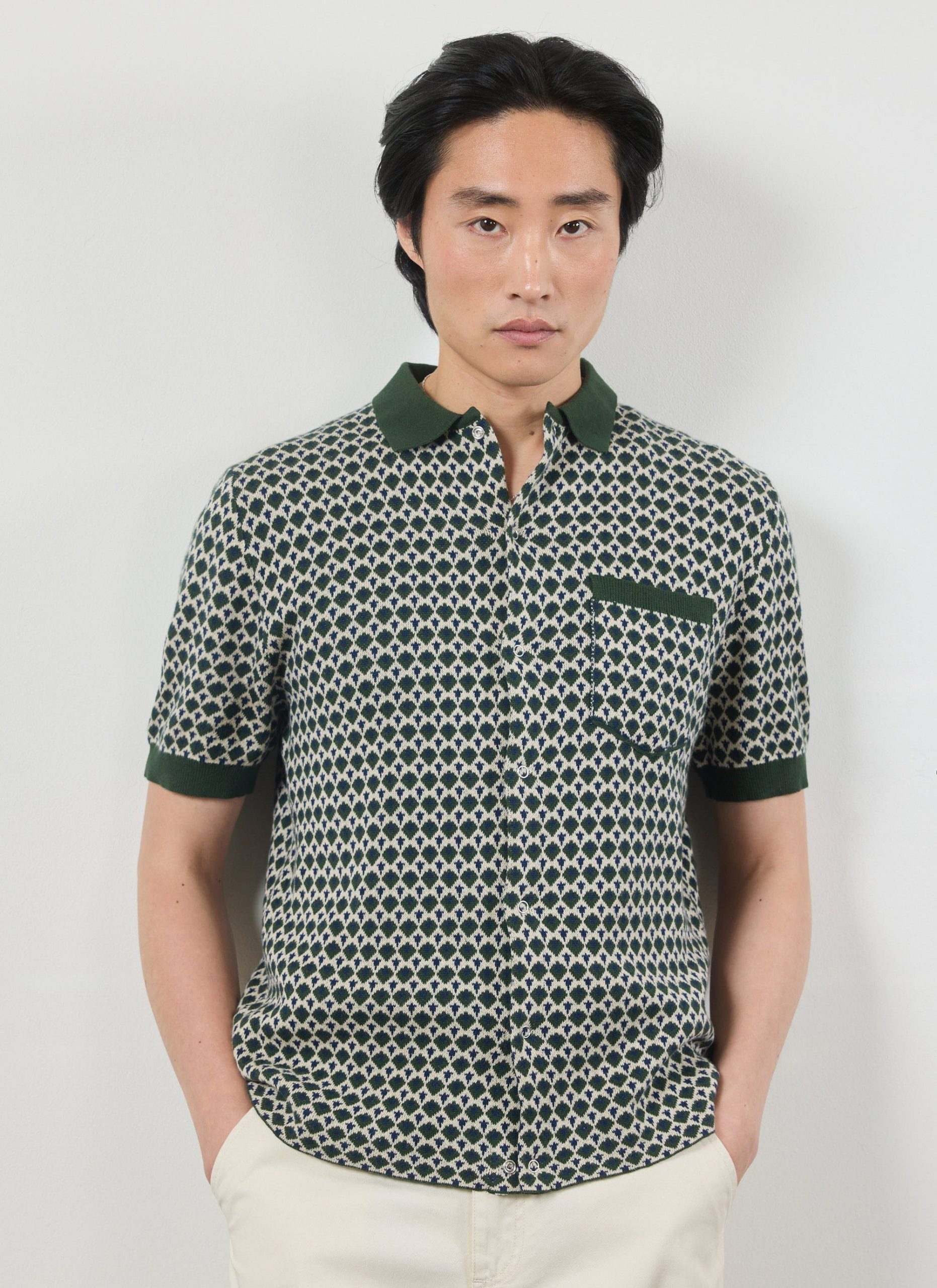 - Features: Men’s Short Sleeve Knitted Shirt in Green Jacquard. Crafted for style and comfort, this patterned shirt features a classic regular fit and detailed with snap buttons, a front chest pocket, and refined ribbed trims on the collar and sleeves. Designed to hold its shape while feeling soft on the skin, this men’s knitwear shirt offers year round wearability. The versatile Casa Picante can be easily layered or worn on its own, pairing effortlessly with any style of trousers for an elevated, everyday look.