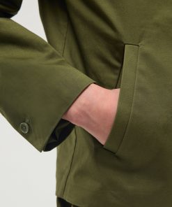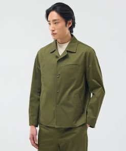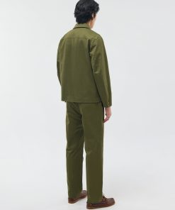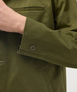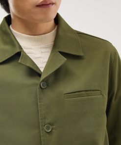- Features: Men’s Chore Jacket in Green. This Workwear Jacket is made from a 100% cotton twill for a heavyweight feel and is perfect for spring and summer. The khaki jacket features an open collar, perfect for wearing with a shirt and tie, custom Percival buttons and jetted pockets. This Heavyweight Cotton Jacket fits true to size and is available in suit chest sizing.