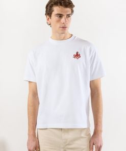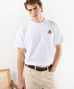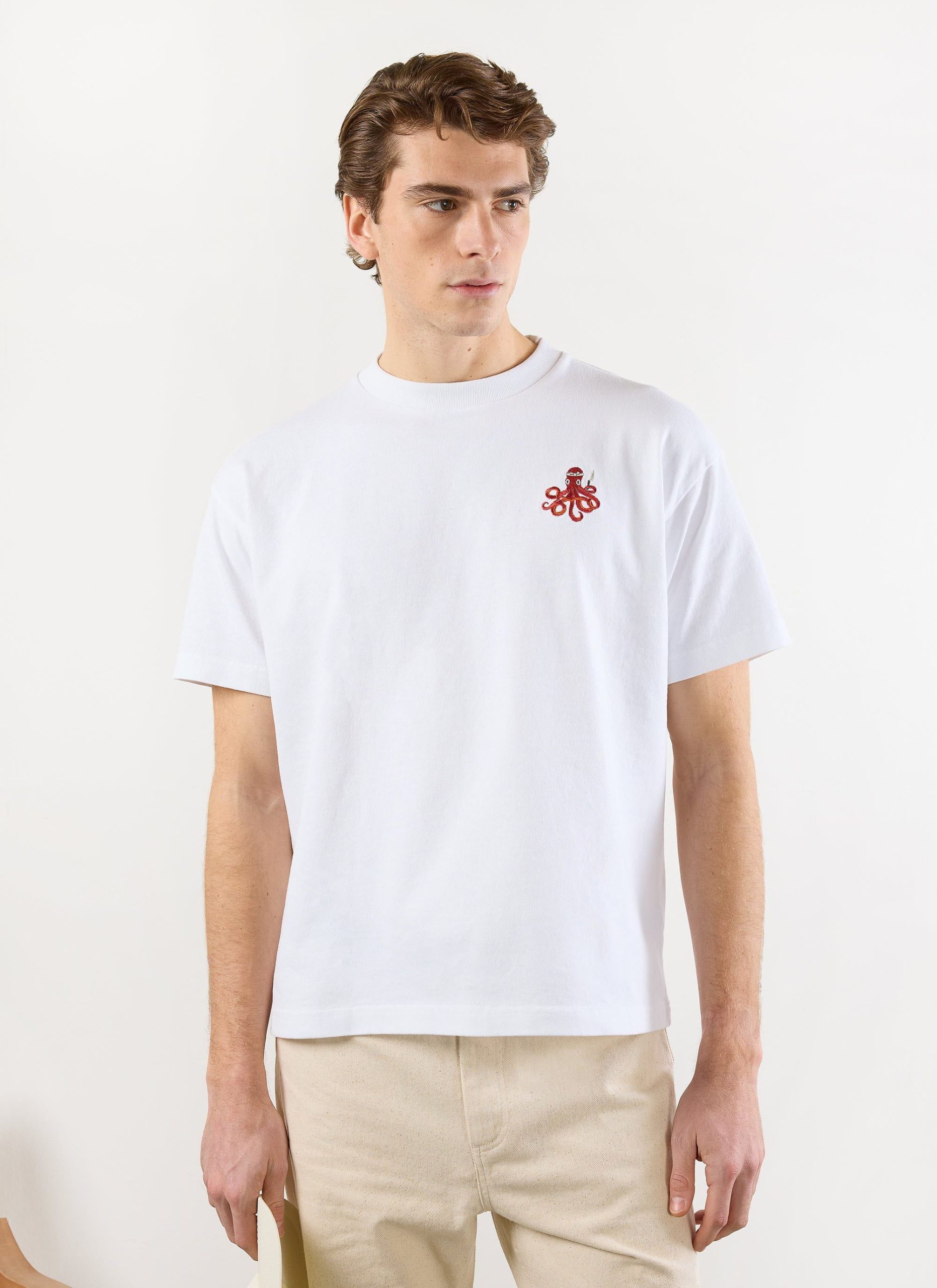 A white t-shirt with an embroidered octopus sushi chef on the front and a screen-printed design on the back—because nothing says “culinary mastery” like a a chef with eight arms and zero stress.