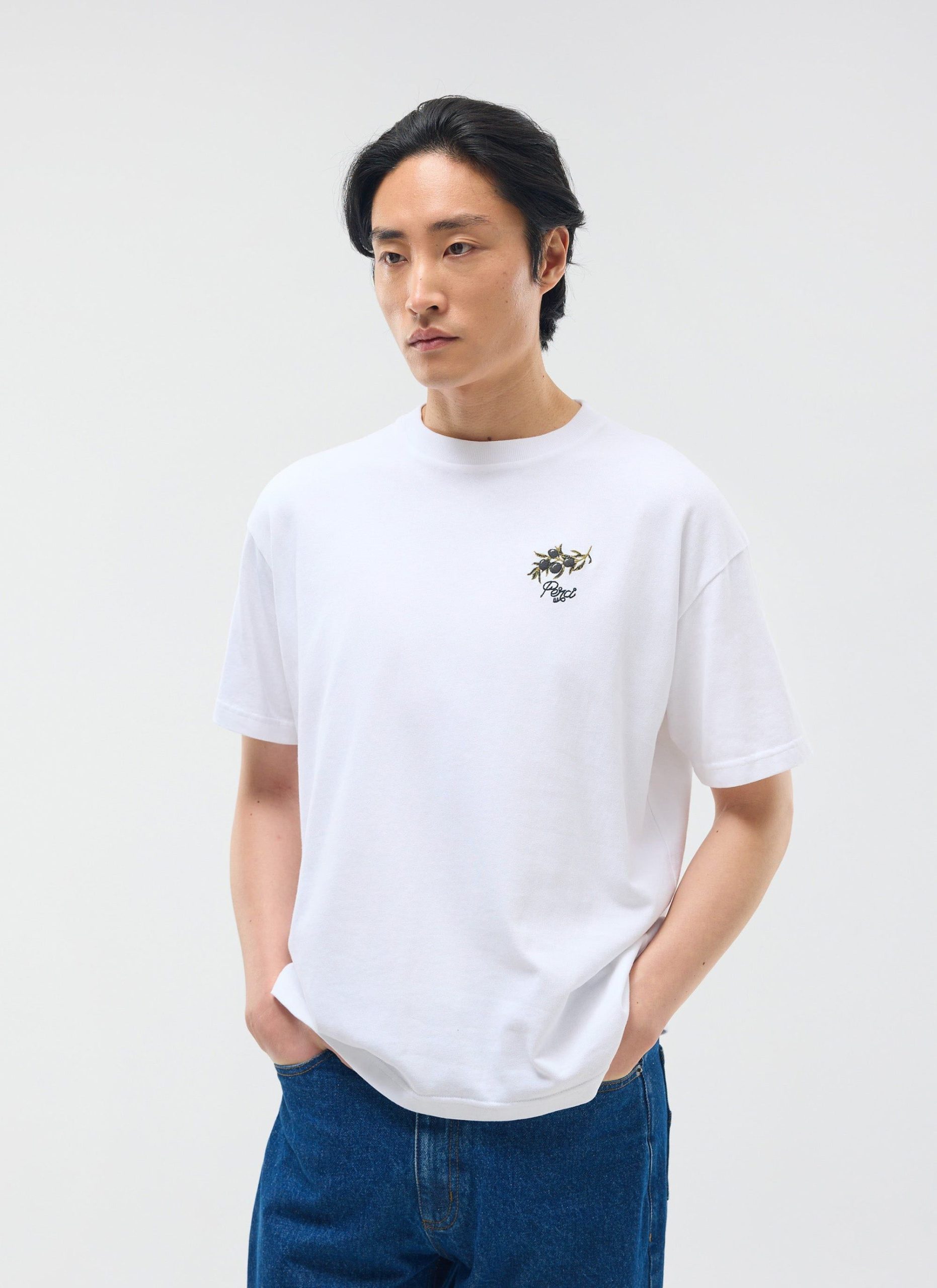 - Features: Men’s Heavyweight white T-Shirt featuring intricate embroidery and print. Crafted from 100% organic cotton, this durable short-sleeve tee offers a premium feel, perfect for everyday wear. Designed in a oversized fit, it pairs effortlessly with any outfit.