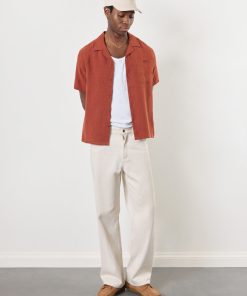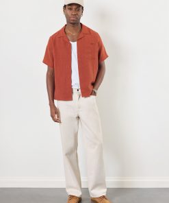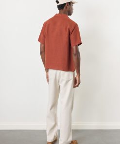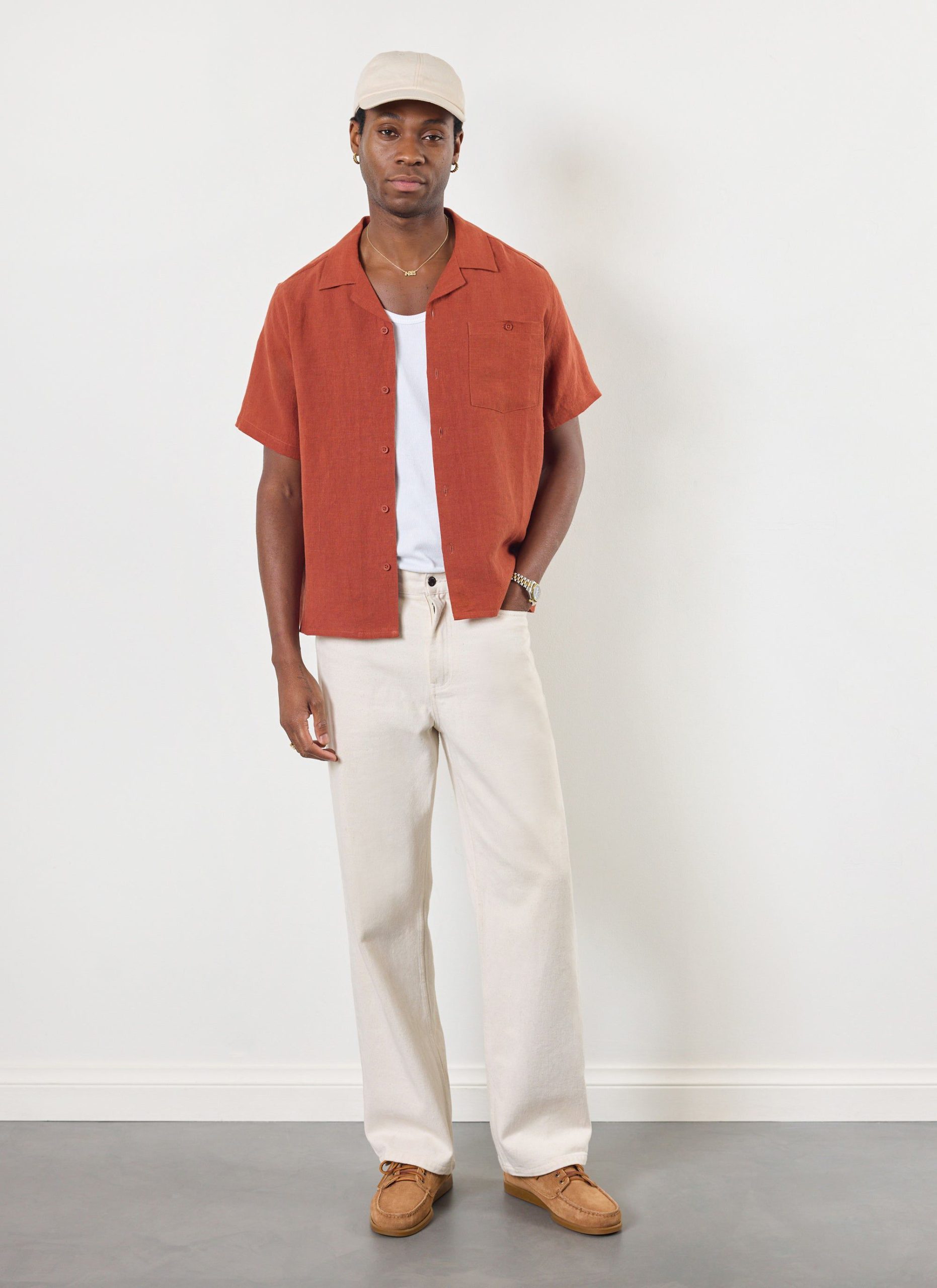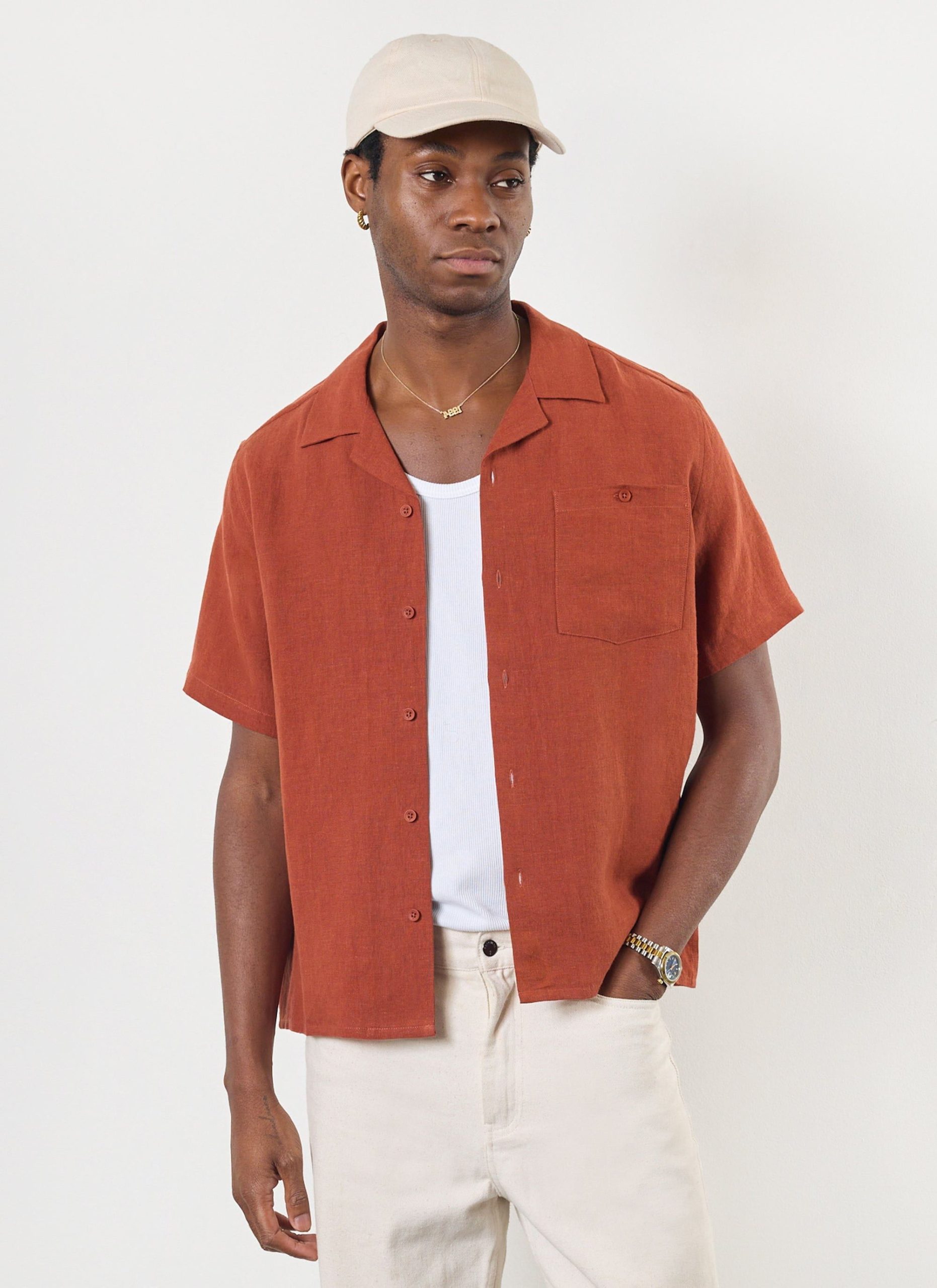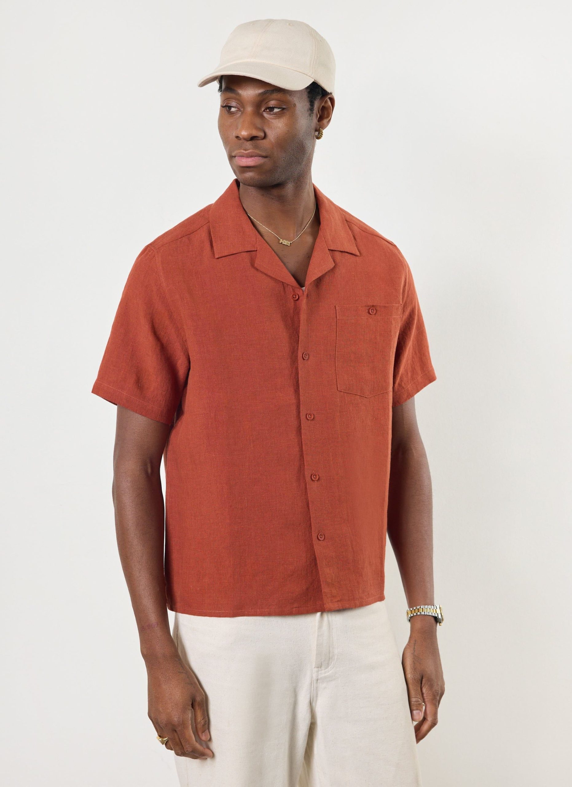 - Features: Men’s Cuban Shirt made from 100% Linen in Rust. The Cuban Collar Shirt features short sleeves, coconut buttons, and increased body widths for a looser, comfortable fit. Percival’s Red Linen Shirt is ideal for the spring and summer months.
