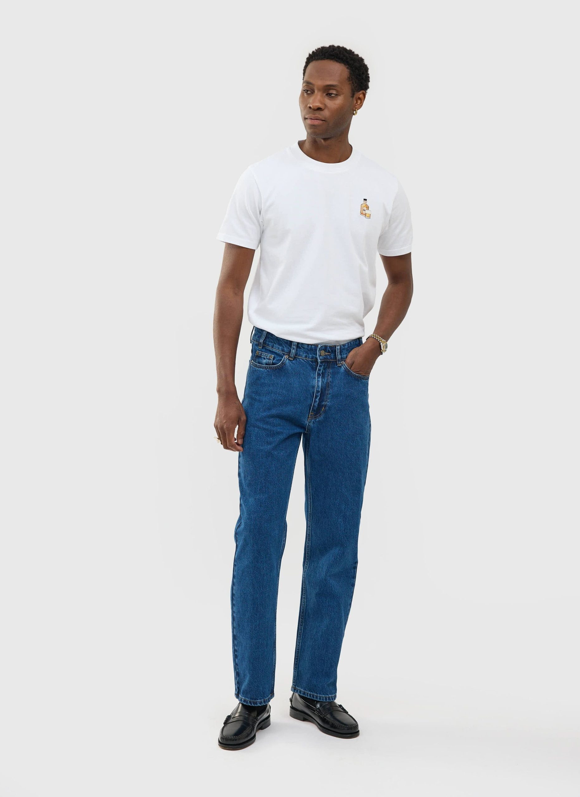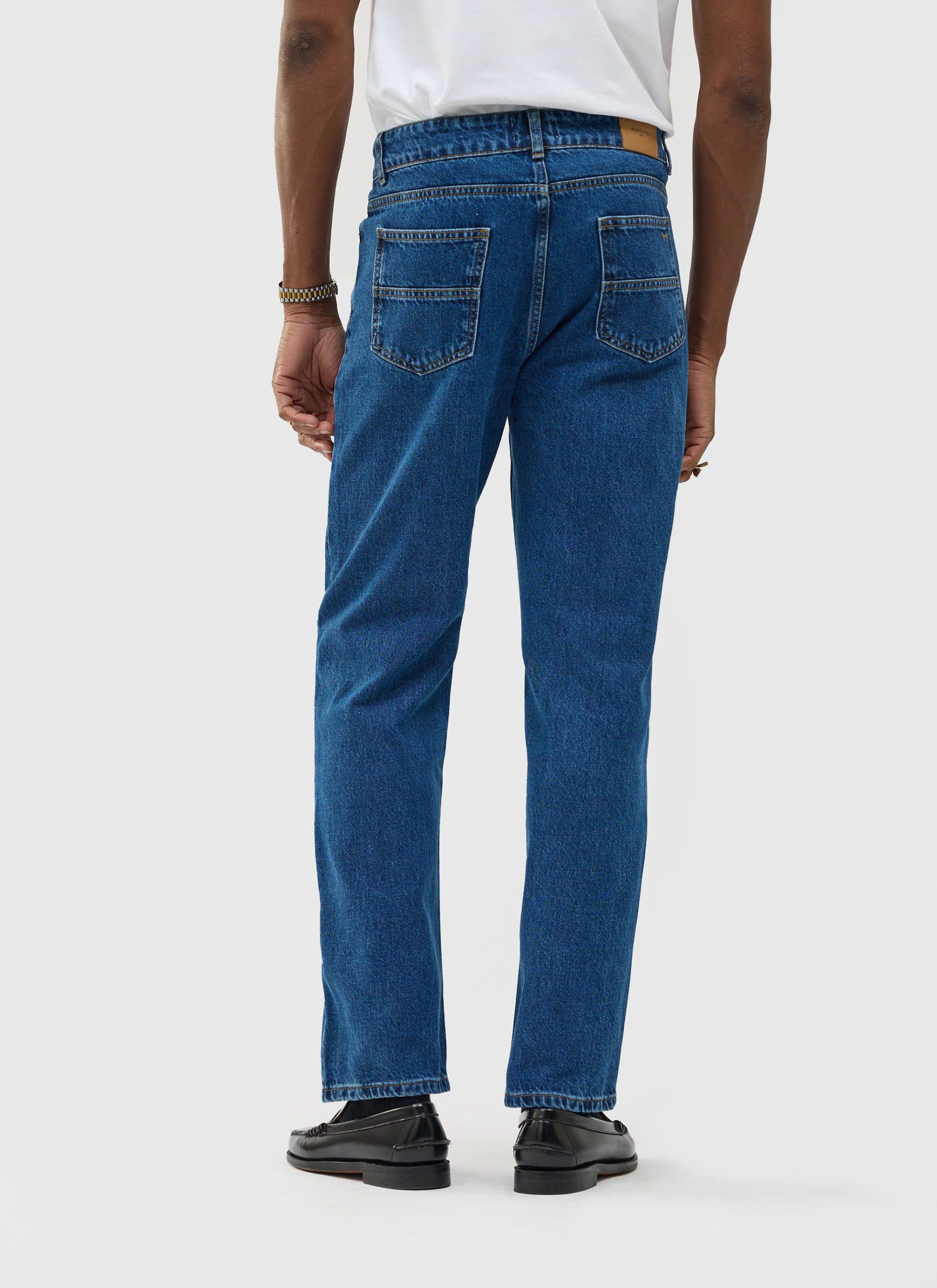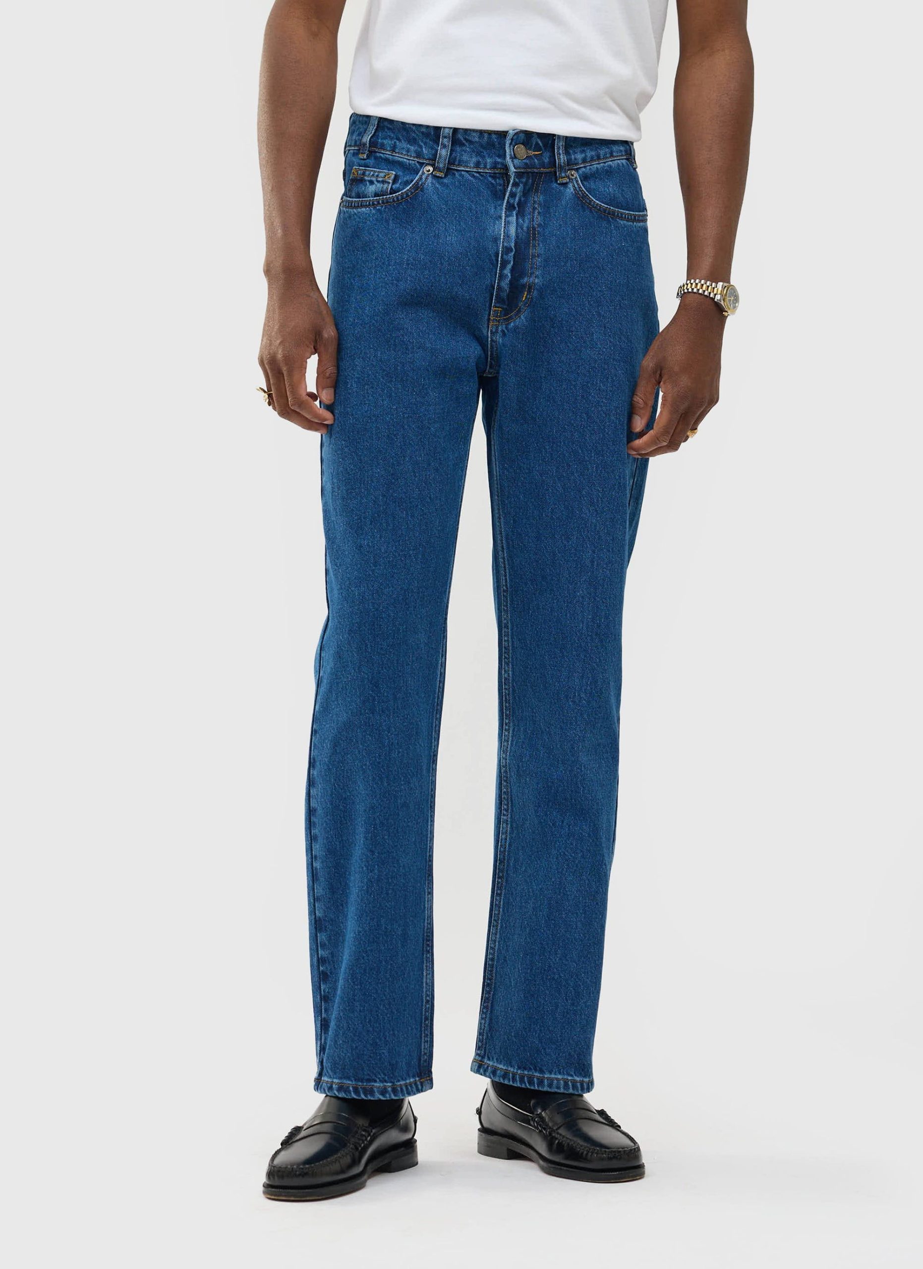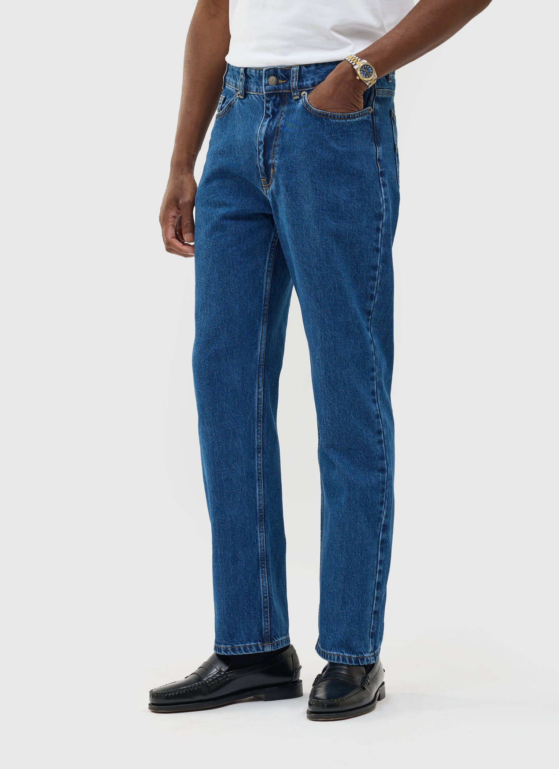 - Features: Men’s jeans in a mid wash blue. Made from a heavyweight 14oz denim and finished with a branded leather tan back waistband patch, these straight leg jeans are ideal for casual fits.