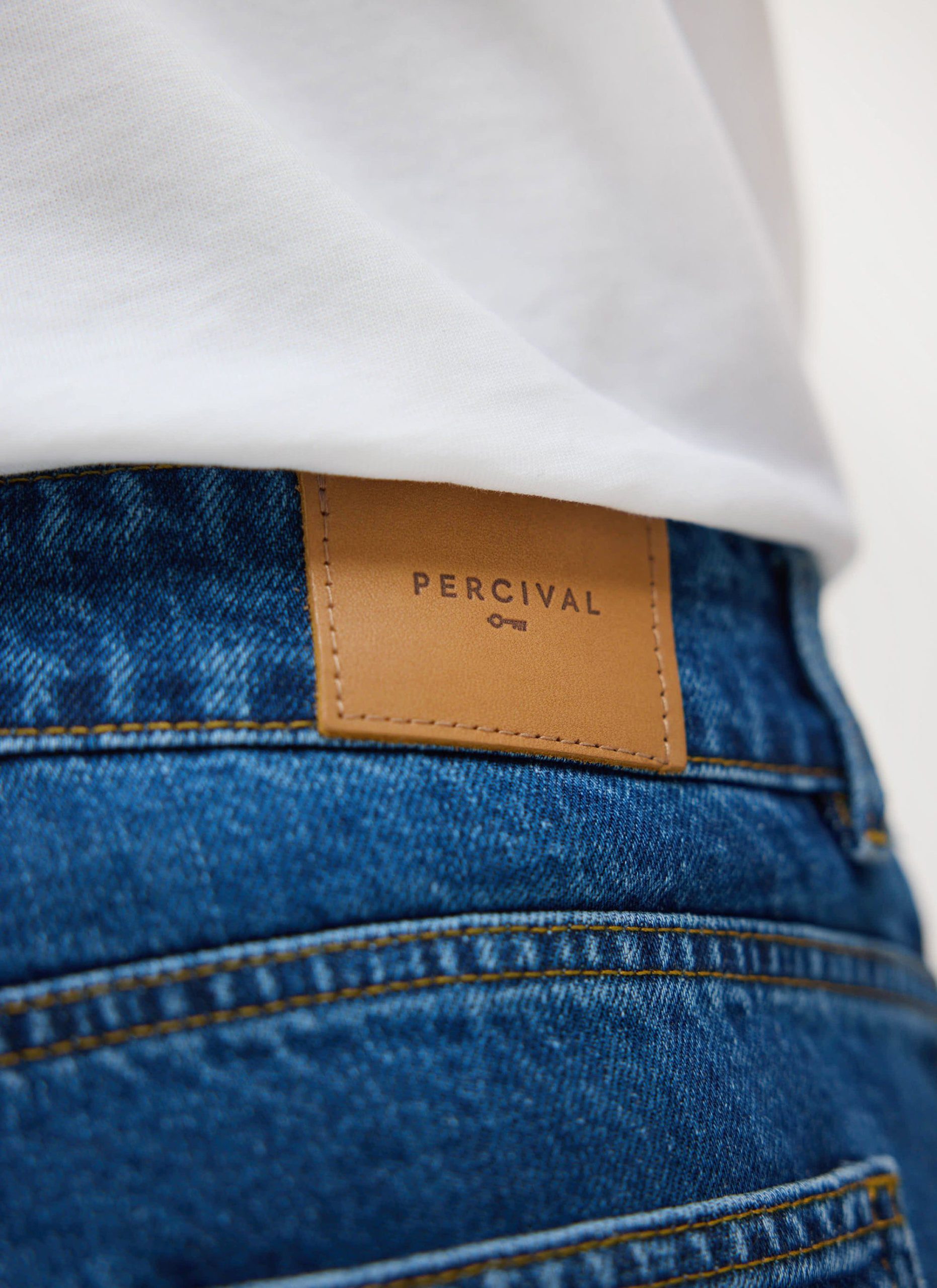 Percival denim is sourced from certified producers. Made from organic cotton, grown without the use of synthetic pesticides and regenerative cotton, which preserves soil health and biodiversity. The denim mill recycles treated water and also collects and reuse pre and post consumer yarns in production.